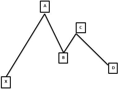 This is exactly like the bullish Gartley, only inverted. This means that the XA move is bearish, AB move is bullish, BC is bearish and CD is bullish. Price is expected to decline from Point D. Here, traders usually attempt to sell at D.