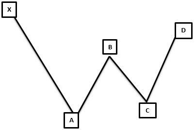 The above figure is a bullish Gartley pattern, which looks like a M on the chart. There are 4 consecutive price swings or trends. A bullish ABCD pattern is preceded by a significant low point of X. The expectation of the pattern is a price reversal, following the CD move. This means that after the bullish Gartley, prices will proceed on to higher levels from Point D.